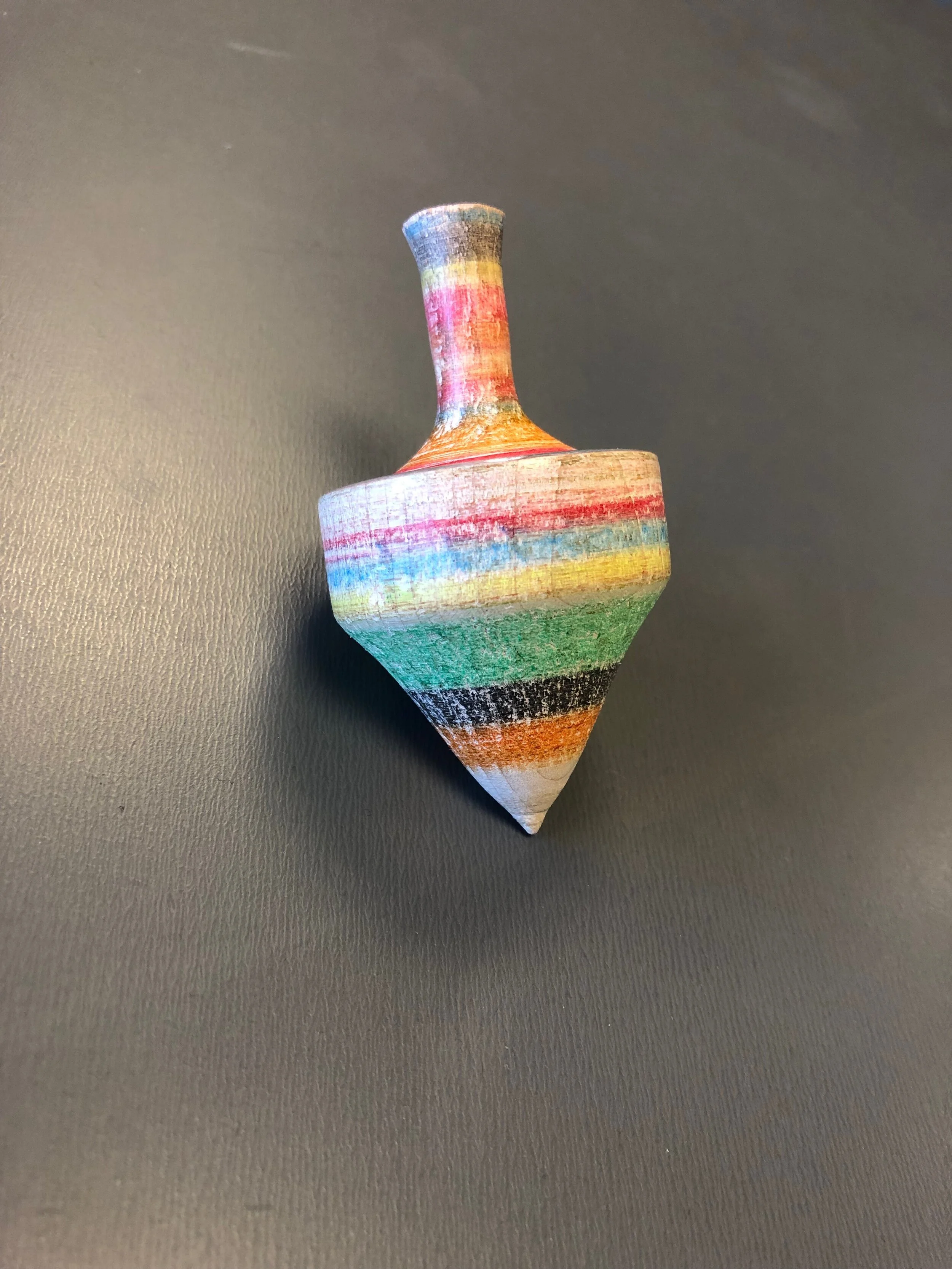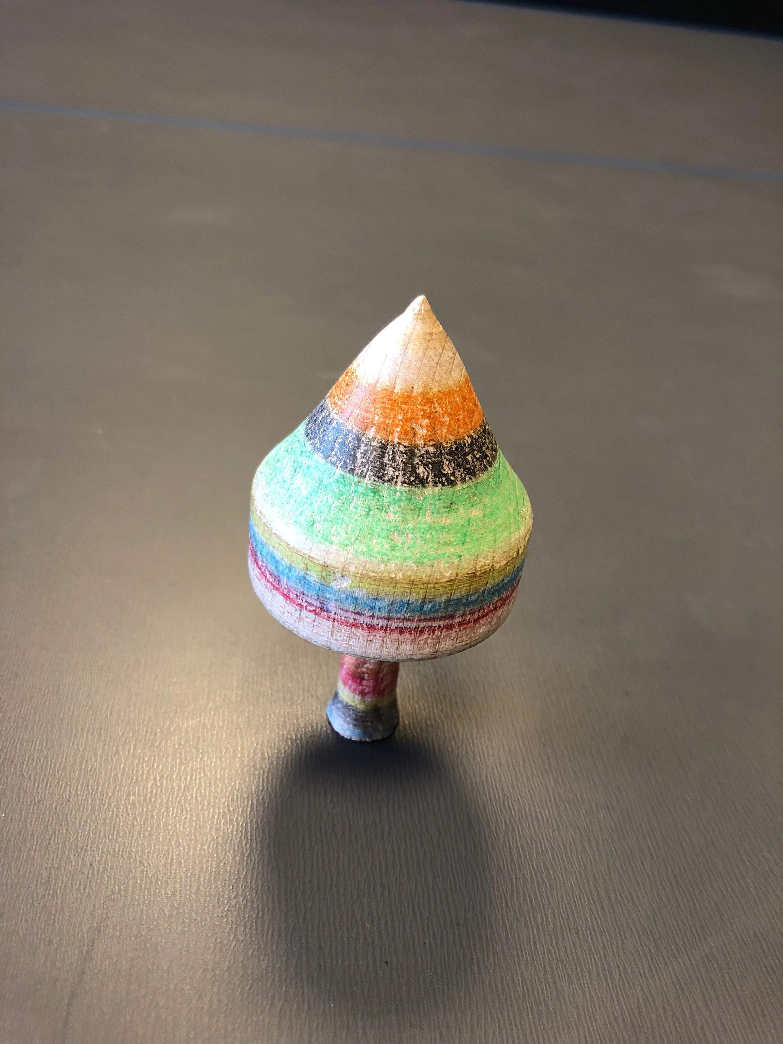 This is a developed idea for a turned object using a a wood lathe machine. This machine works by subtracting wood. I used basswood and hard wax (surface finish); a roughing gouge to subtract the wood, a spindle gauge to shape the spinning top, sanding paper and wax to finish the wood while it was still turning. Click here to see the spinning top in action!